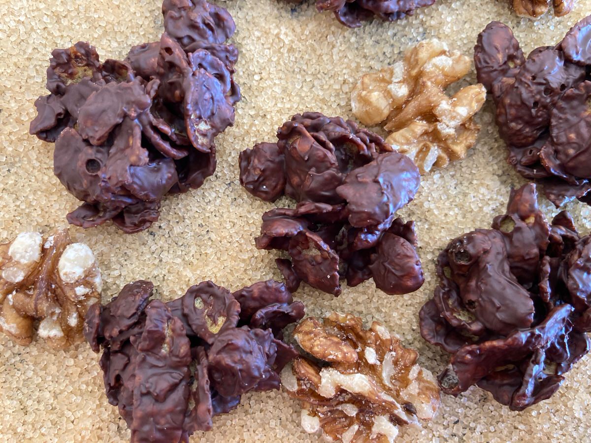 湯煎でチョコレートをクリーム状に溶かして、プレーンのコーンフレークを混ぜて一口大にまとめるだけ。
