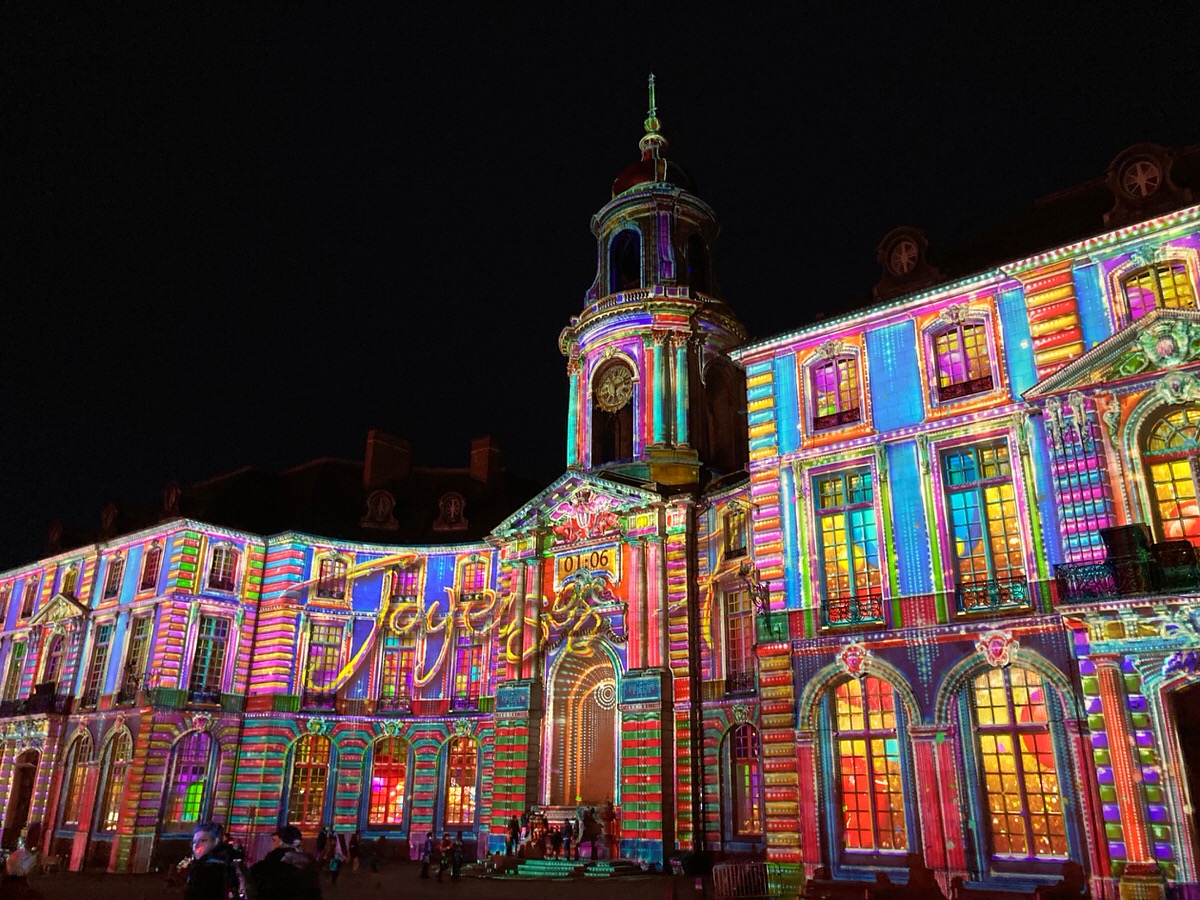 村を離れて街に入ると、建物に映し出されるプロジェクションマッピングの鮮やかなイルミネーションがあふれています。